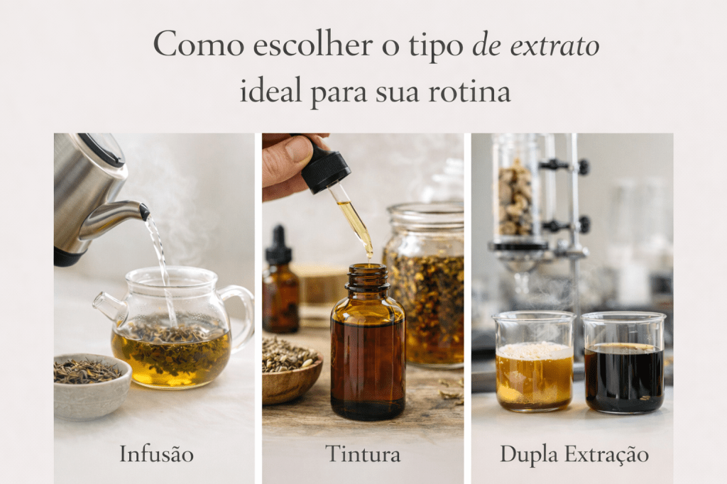 Com tantas opções disponíveis — infusões, tinturas e extratos por dupla extração — é comum surgir a dúvida: qual tipo de extrato escolher?